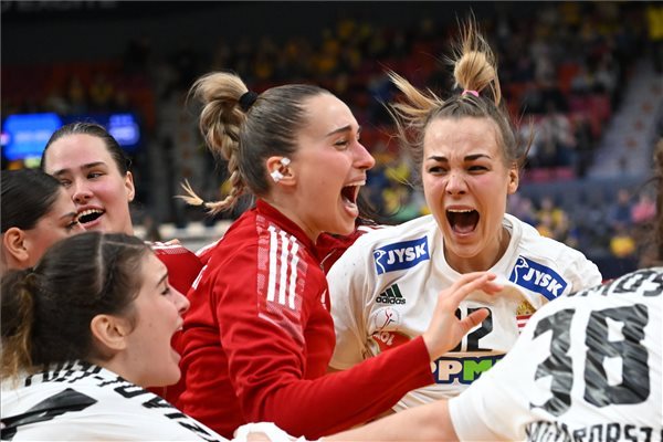 A magyar válogatott tagjai ünnepelnek, miután 23-22-re győztek az olimpiai kvalifikációs női kézilabda-világbajnokság középdöntőjének harmadik fordulójában játszott Magyarország - Horvátország mérkőzésen a svédországi Göteborgban 2023. december 11-én. MTI/Illyés Tibor