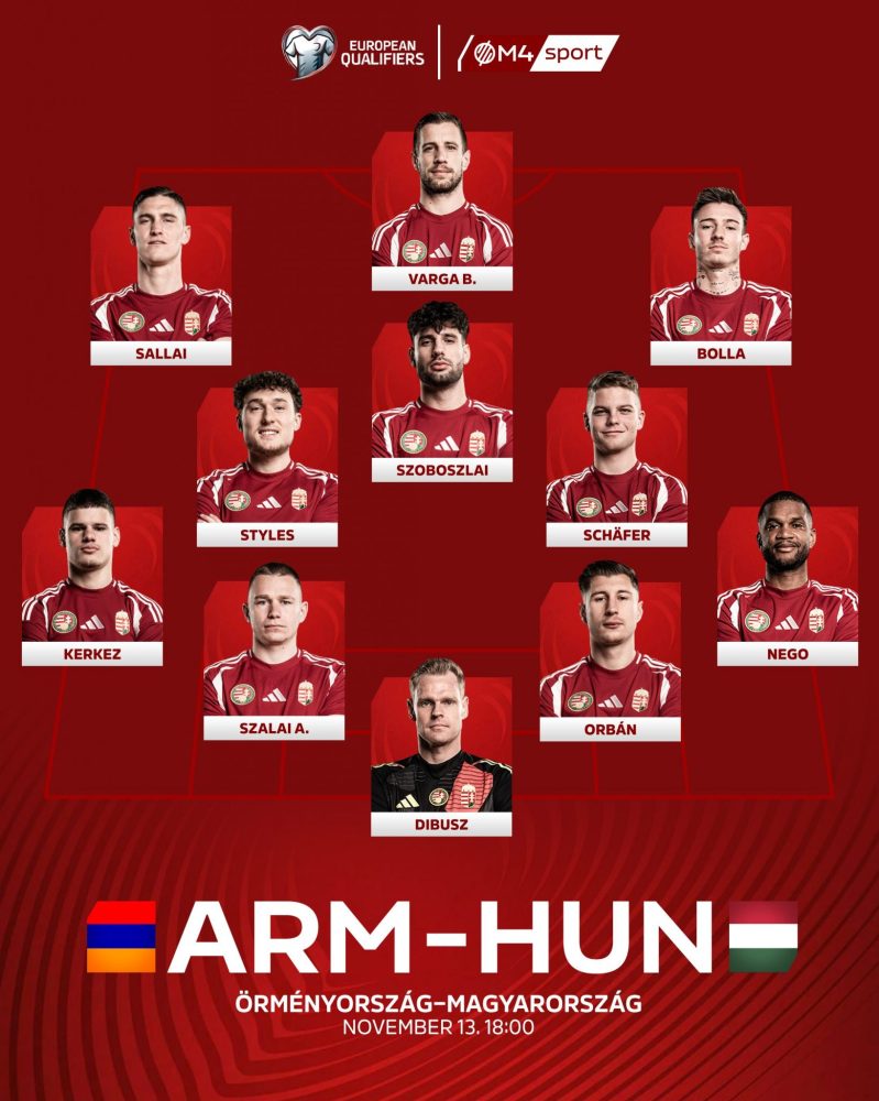 A védelmet a lisszaboni 2–2-es döntetlenhez hasonlóan ismét Loic Nego, Willi Orbán, Szalai Attila és Kerkez Milos fogja alkotni. A középpályán sem lesz változás, a csapatkapitány Szoboszlai Dominik és Schäfer András is mérföldkőhöz érkezik, előbbi 60., utóbbi 40. alkalommal húzza magára a címeres mezt, a sor harmadik tagjaként a West Bromwichnál futballozó Callum Styles zsinórban az ötödik vb-selejtezőn is kezdőként léphet pályára.