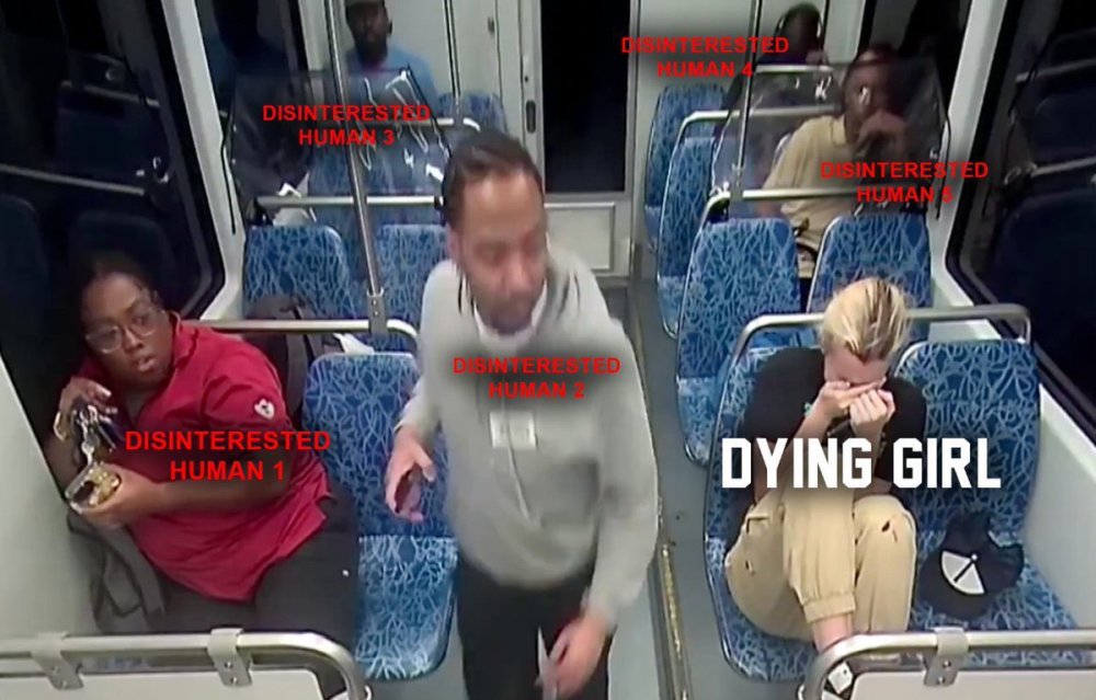 Az amerikai Charlotte-ban egy hajléktalan – történetesen fekete bőrű – férfi hidegvérrel meggyilkolt egy 23 éves, törékeny ukrán menekült lányt, Irina Zaruckát, majd egyszerűen leszállt a metróról, mintha mi se történt volna. A biztonságikamera-felvételen látszik, ahogy Irina sokkos állapotban sír összegörnyedve, majd összeesik és elvérzik. A hozzá közelebb ülő – mellékesen szintén színes bőrű – utastársak vagy nem veszik észre az agóniáját, vagy közönyösen elsétálnak mellette. Amikor pedig a kocsi másik feléből érkező utas végre megpróbál segíteni, már túl késő.