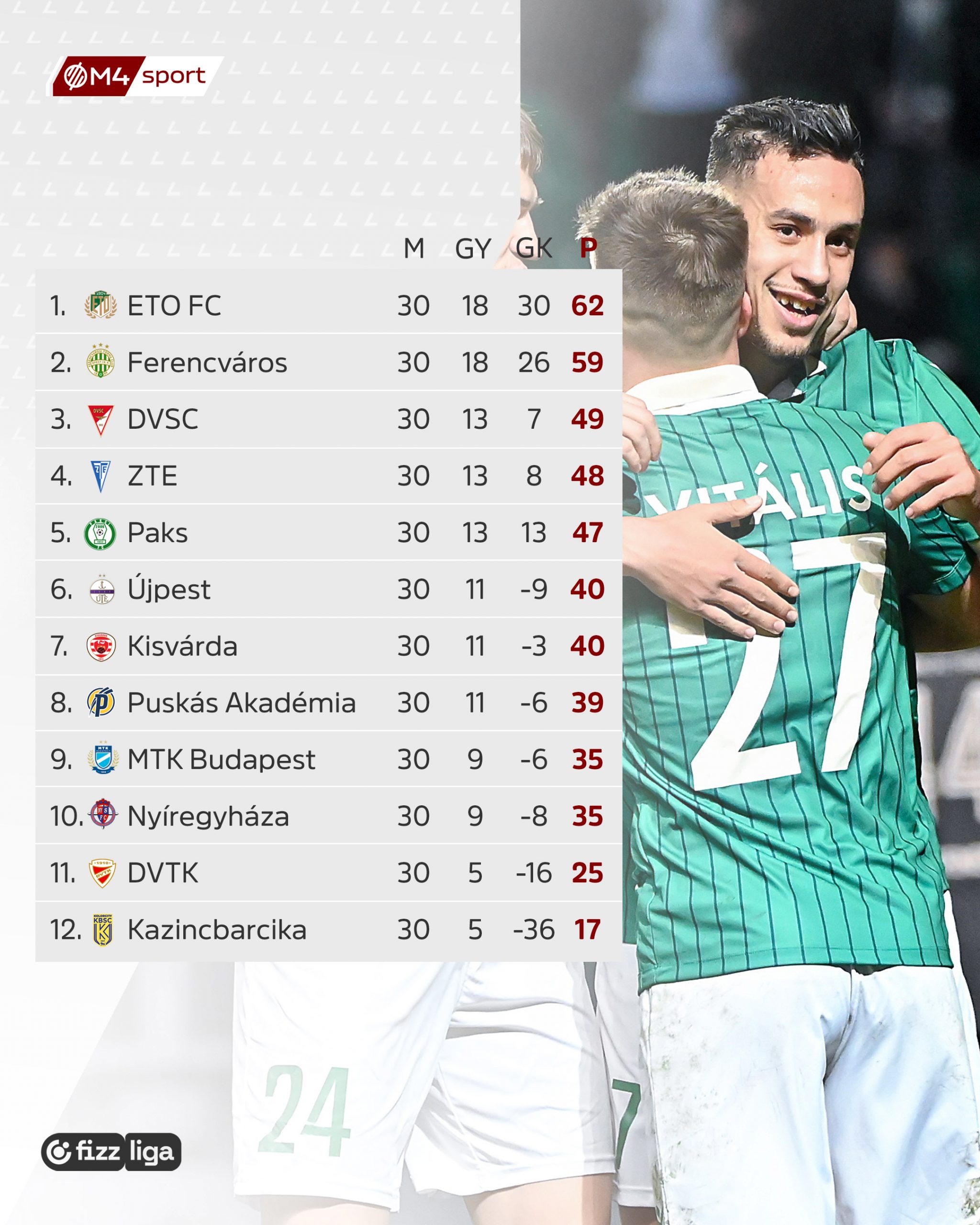 A harmadik helyet a Vasutas, a ZTE vagy a Paks szerezheti meg. Klubfutballunk érdeke valószínűleg az lenne, hogy a jelenleg is a dobogón tanyázó Vasutas legyen a bronzérmes, ebben az esetben a Konferencia-ligában indulhatna. A debreceni klubot az értékeli föl, hogy néhány hete Bogdán Ádám a sportigazgató. Ez az angol labdarúgásban edződött szakember akkora agykapacitást testesít meg, amely a következő években élre emelheti a Vasutast, és nemzetközi mezőnyben is ütőképes gárdává válhat.